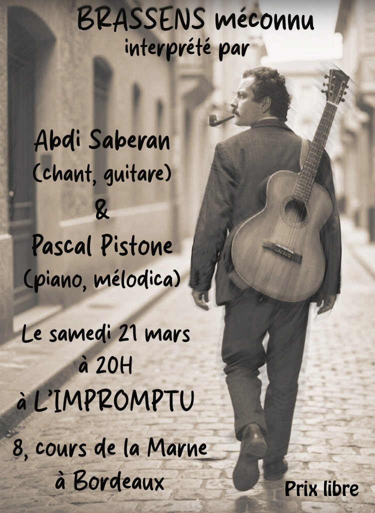 - Samedi 21 mars 2026, à 20h : Chansons : Brassens méconnu - avec Abdi Saberan (voix, guitare) et Pascal Pistone (piano) - affiche